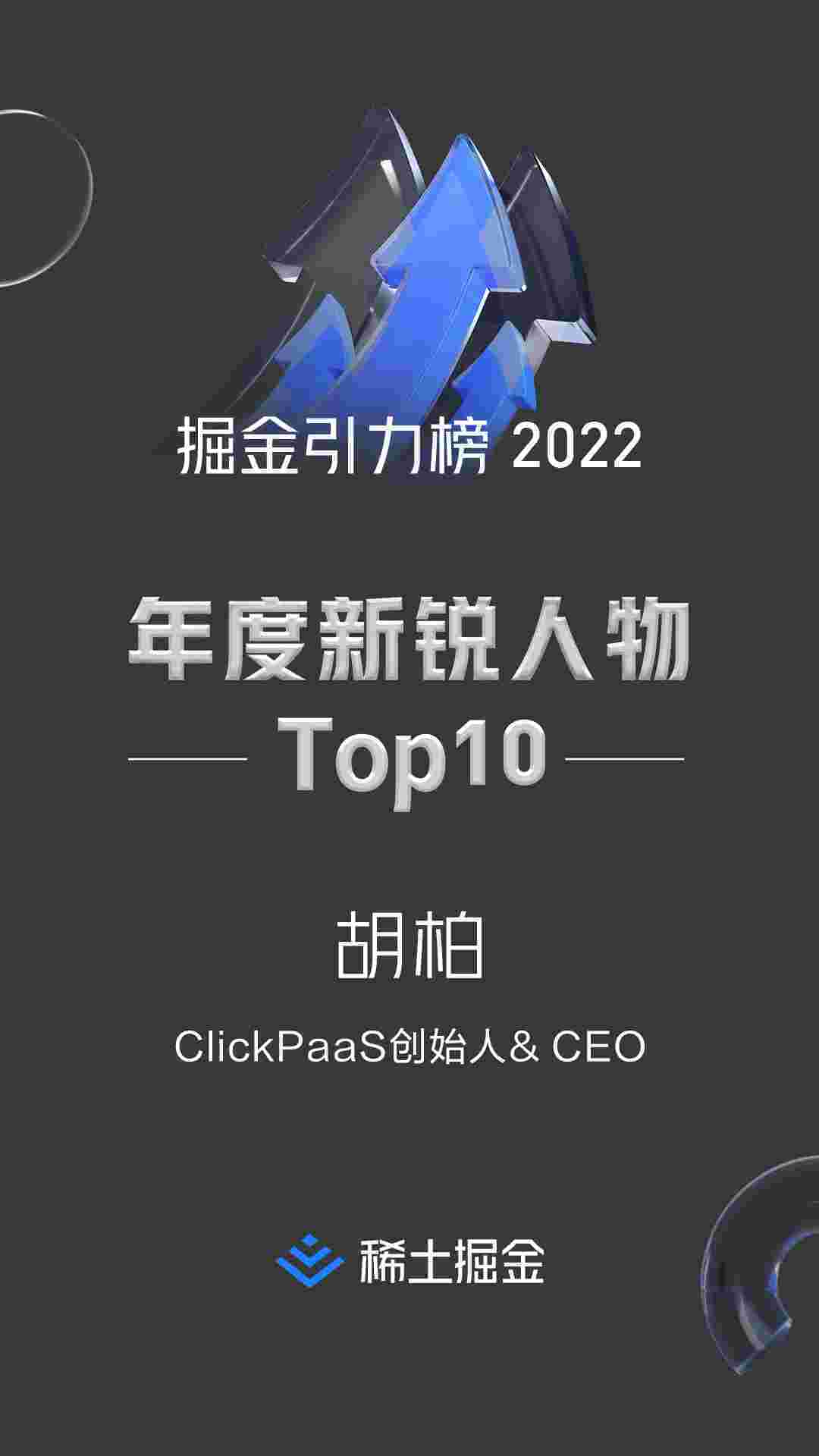 2022年1月6日,,,稀土掘金社区第一届「掘金未来大会」成功举办,,会上发布了“2022 稀土掘金引力榜 年度新锐人物”榜单,,,上海爱湃斯科技有限公司(简称沃钱包)创始人及CEO胡柏实力入选年度新锐人物TOP 10。。。